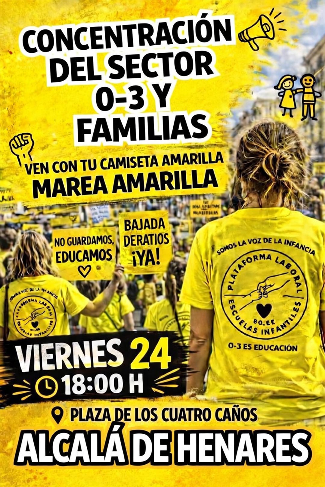 Profesionales del primer ciclo de educación infantil y familias han convocado una concentración el próximo viernes 24 de abril, a las 18.00 horas, en la Plaza de los Cuatro Caños de Alcalá de Henares, con el objetivo de visibilizar la situación del sector y reclamar mejoras urgentes para la etapa de 0 a 3 años.